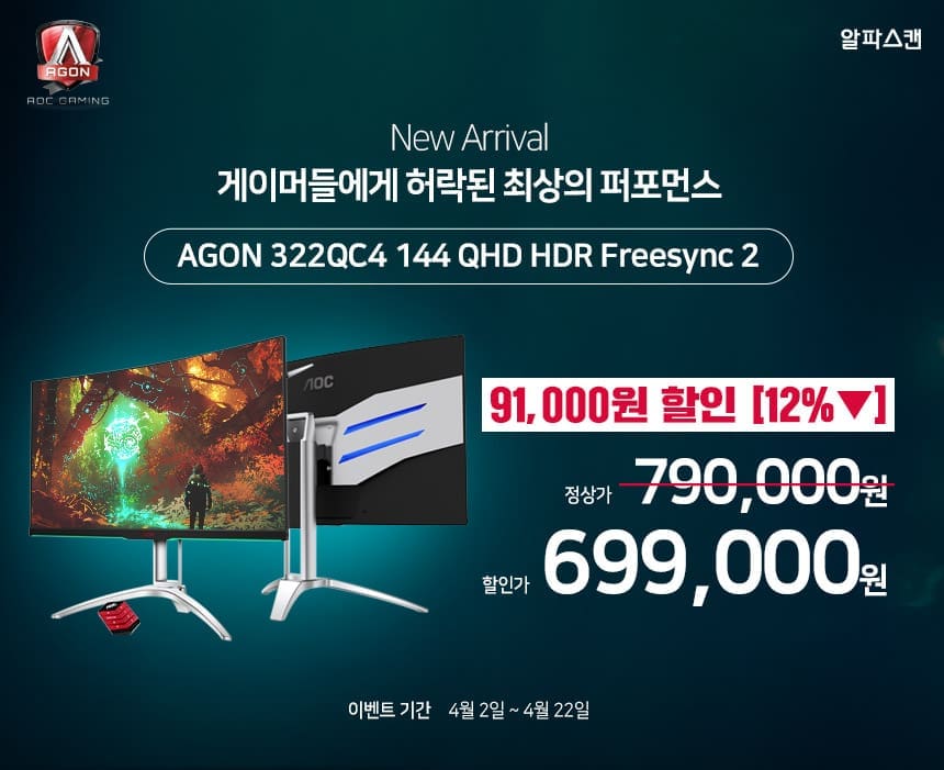 한편 신제품 322QC4는 네이버 플레이윈도를 통해 출시되었으며, 4월 22일까지 출시 기념 특가 행사가 진행되고 있어 정상가에서 12%(9만원) 할인된 699,000원에 구매할 수 있다.