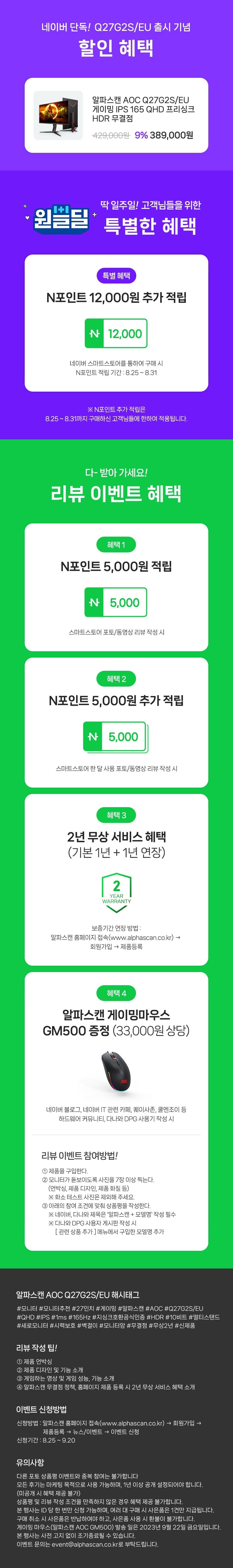 한편 8월 25일부터 9월 14일까지 알파스캔 네이버 스마트스토어 단독으로 진행되는 출시기념 행사에서는 4만원 할인 혜택을 제공해 Q27G2S/EU를 389,000원에 구매할 수 있다. 전 고객 무료배송 혜택을 제공하며, 스마트스토어에 포토/동영상 리뷰 작성시 네이버포인트 5천원 증정, 한달사용 포토/동영상 리뷰 작성시 네이버포인트 5천원 추가 증정, 블로그 및 커뮤니티에 포토리뷰를 올리면 2만 5천원 상당의 알파스캔 게이밍 마우스 GM500을 증정한다. 또한 8월 25일부터 31일까지 구매하는 고객에 한해 네이버포인트 12,000원을 추가 증정해 모든 혜택을 다 받을 경우 신제품 Q27G2S/EU를 36만원 대에 구매하는 셈이다.