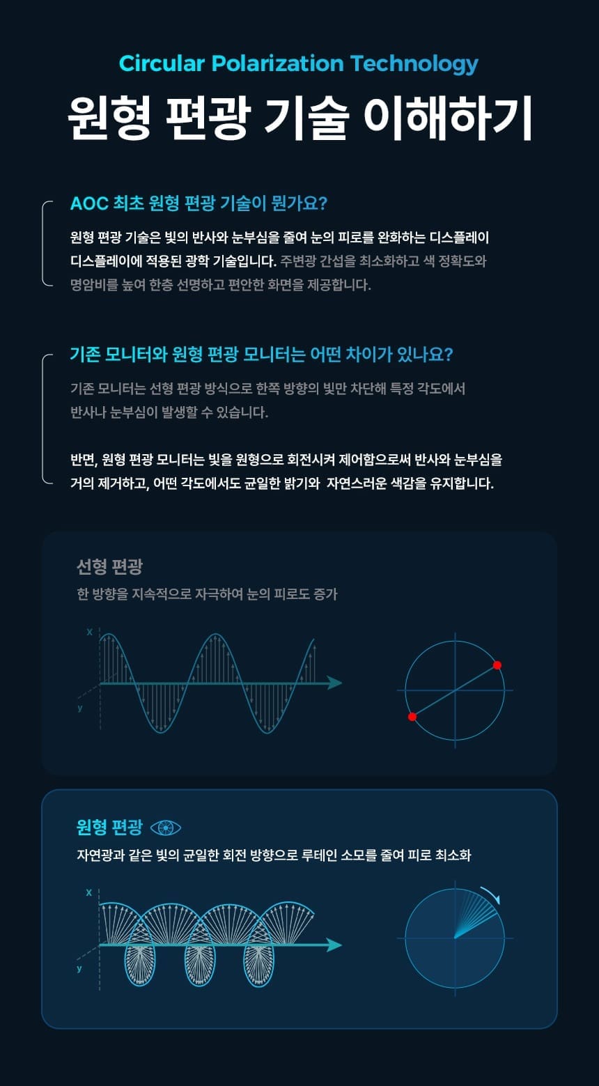 ㈜알파스캔디스플레이가 빛의 반사와 눈부심을 구조적으로 줄이는 원형편광(Circular Polarization) 기술을 적용한 AOC 게이밍 모니터 ‘Q27G4SL’을 출시했다. 기존 시력보호 기능을 넘어, 빛의 전달 방식 자체를 개선한 것이 특징이다.