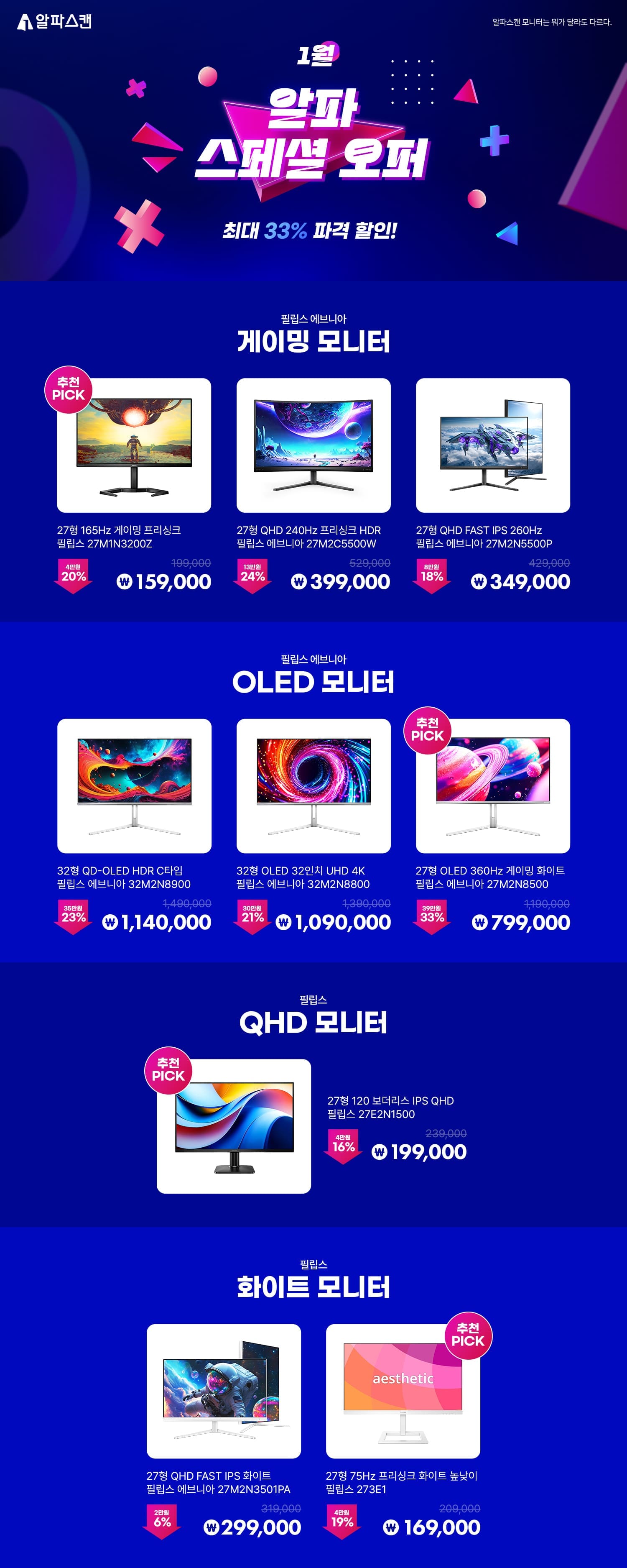 ㈜알파스캔디스플레이가 1월 한정 프로모션 ‘알파 스페셜 오퍼’를 진행한다. 이번 행사는 최대 33%의 할인 혜택을 제공하며 게이밍 모니터, OLED, QHD, 화이트 감성 모니터까지 다양한 인기 제품을 특별가로 선보인다. 알파스캔은 이번 프로모션을 통해 고성능 게이밍 수요는 물론, 홈오피스·학습·콘텐츠 시청 등 일상 활용이 높은 실속형 제품군까지 폭넓게 구성해 소비자 선택 폭을 넓혔다.
