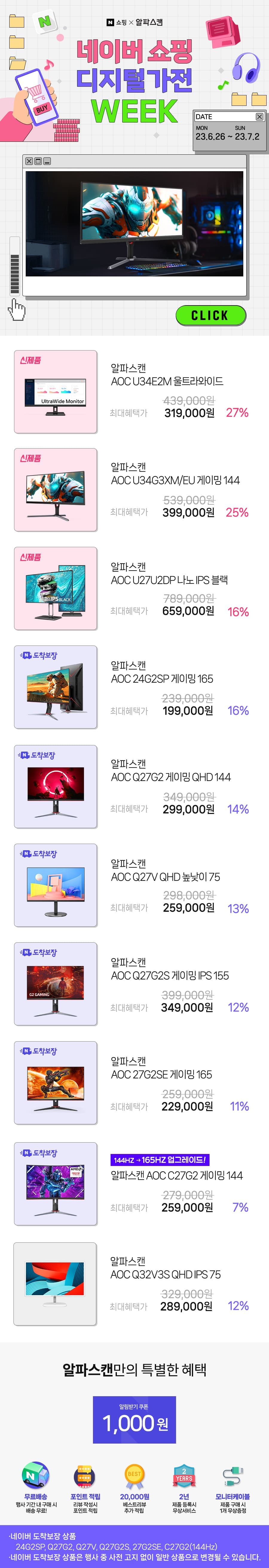 6월 26일부터 7월 2일까지 1주간 진행되는 이번 행사에 참여하는 모델은 게이밍 모니터 U34G3XM/EU, 24G2SP, Q27G2, Q27G2S, 27G2SE, C27G2와 전문가용 모니터 U27U2DP, 그리고 일반 사무용 모니터 U34E2M, Q32V3S, Q27V이며, 최대 27%의 할인과 무료배송 혜택을 제공한다. 행사 모델 중 C27G2는 144Hz에서 165Hz로 무상 업그레이드 혜택도 제공한다.