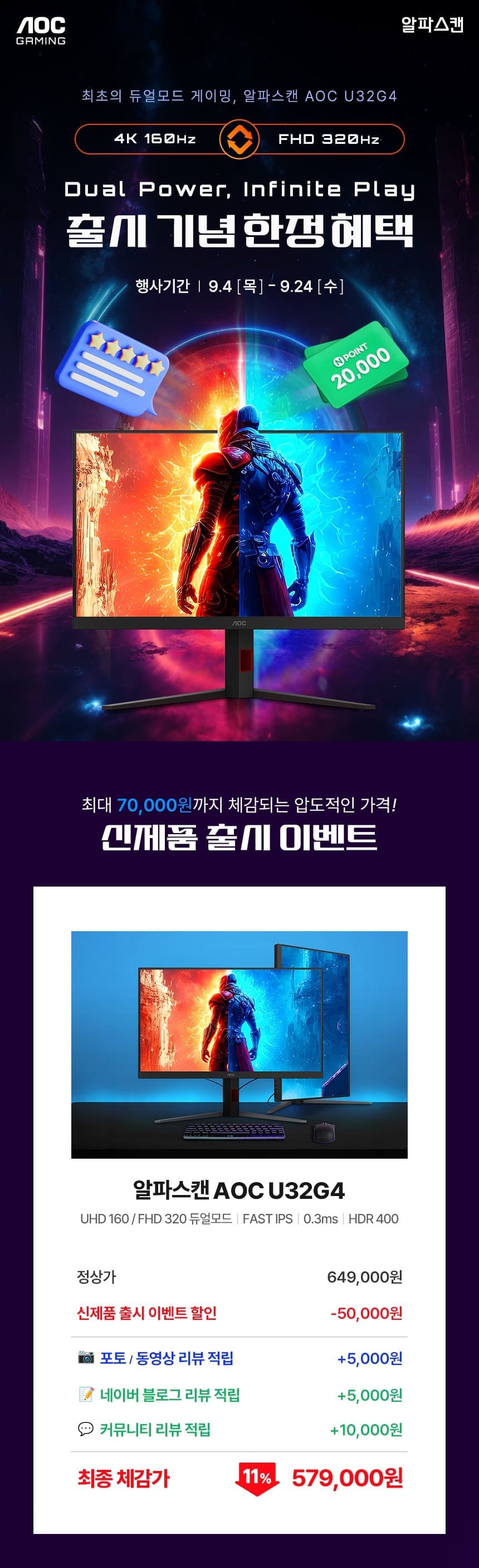 U34G4 출시 행사는 9월 24일까지 알파스캔 홈페이지와 네이버 브랜드스토어에서 진행되며 5만원 할인혜택으로 599,000원의 특별가에 구매할 수 있다. 구매 사이트에 포토/동영상 리뷰를 등록하면 N포인트 5천원을, 네이버 블로그에 리뷰를 작성하면 N포인트 5천원을 추가 증정한다. IT 관련 네이버 카페·하드웨어 커뮤니티·다나와 DPG에 리뷰 등록 시 추가로 N포인트 1만원이 지급되어, 모든 리뷰 참여 시 2만원의 포인트 혜택을 받을 수 있다.