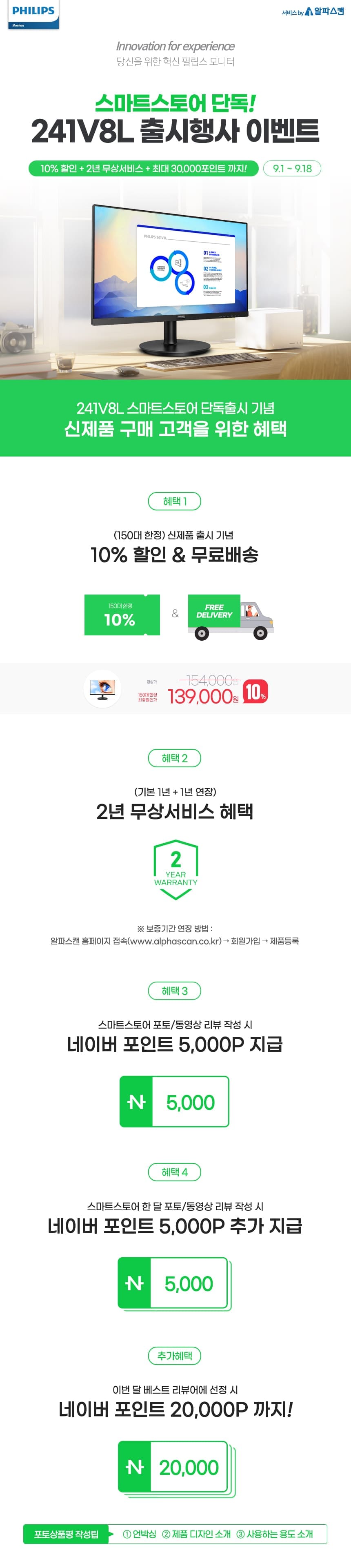 9월 1일부터 18일까지 네이버 스마트스토어 단독으로 진행되는 출시기념 행사에서는 150대 한정 10% 할인을 제공해 241V8L을 139,000원에 구매할 수 있고, 2년 무상서비스와 무료배송 혜택도 받을 수 있다. 스마트스토어에 포토/동영상 리뷰를 작성하면 네이버포인트 5,000P를 지급하고, 한 달 포토/동영상 리뷰 작성시 네이버포인트 5,000P를 추가 지급한다. 또한 이 달의 베스트 리뷰어로 선정되면 네이버포인트 20,000P를 추가로 받을 수 있다.
