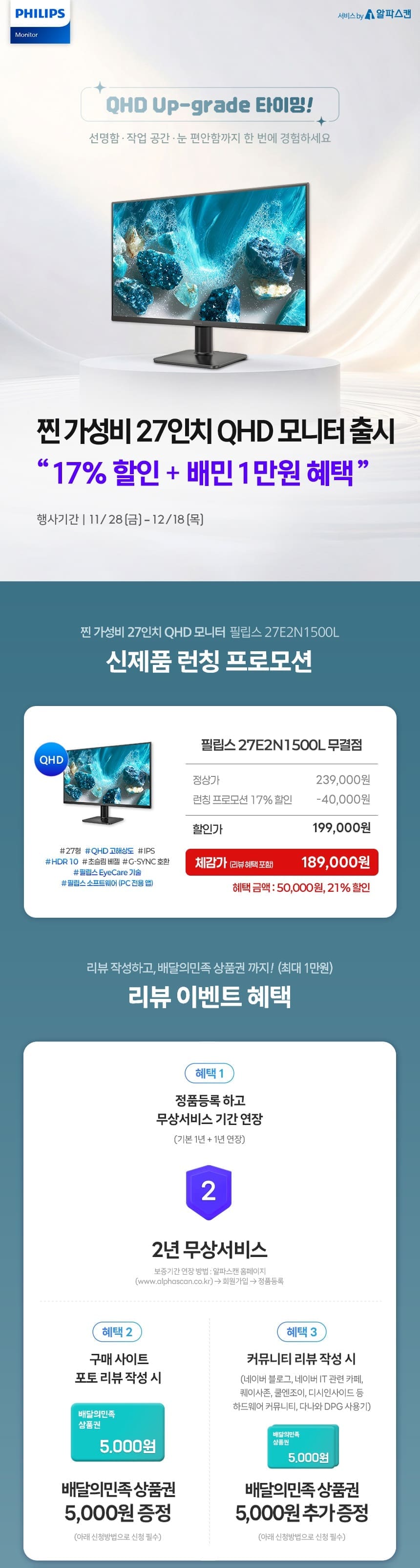 12월 18일까지 진행되는 출시 기념 행사에서는 4만원(17%) 할인혜택을 제공해 27E2N1500L을 199,000원에 구매할 수 있다. 무료 배송과 2년 무상 A/S는 물론, 구매 사이트 포토·동영상 리뷰 작성 시 배민 상품권 5천원을 증정하고, IT 전문 네이버 카페, 하드웨어 커뮤니티, 다나와 DPG 등 커뮤니티 리뷰 작성 시 5천원의 배민 상품권을 추가로 증정한다. 모든 리뷰 참여시 신제품을 5만원(21%)할인된 189,000원에 구매하는 셈이다.
