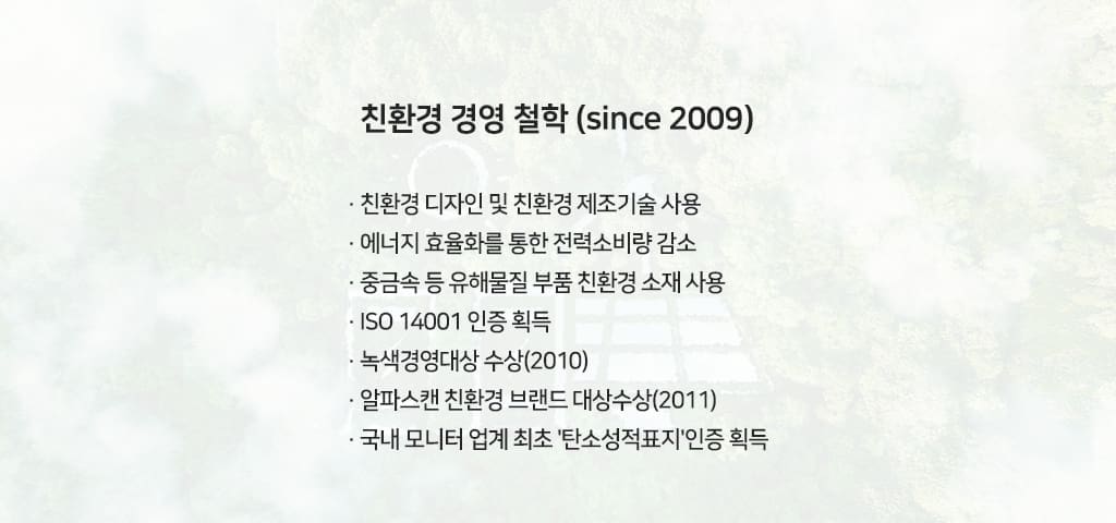 고객 행복, 친환경, 디자인, 품질로 요약되는 4대 경영철학을 바탕으로 고객이 원하고 필요로 하는 제품과 서비스를 제공하기 위해 지속적으로 연구 개발하고 있으며, 고객과 함께 성장하여 국내 모니터시장 점유율 3위의 독보적인 위치를 차지하고 있습니다.