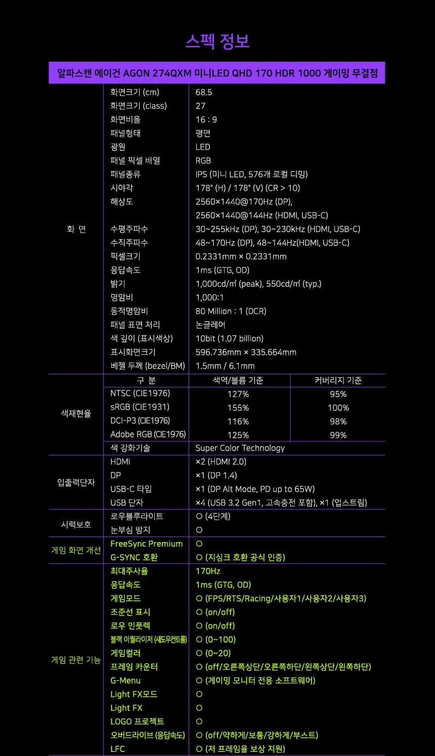 [깜짝할인] 알파스캔 에이건 AGON 274QXM 미니LED QHD 170Hz HDR 1000 게이밍 무결점