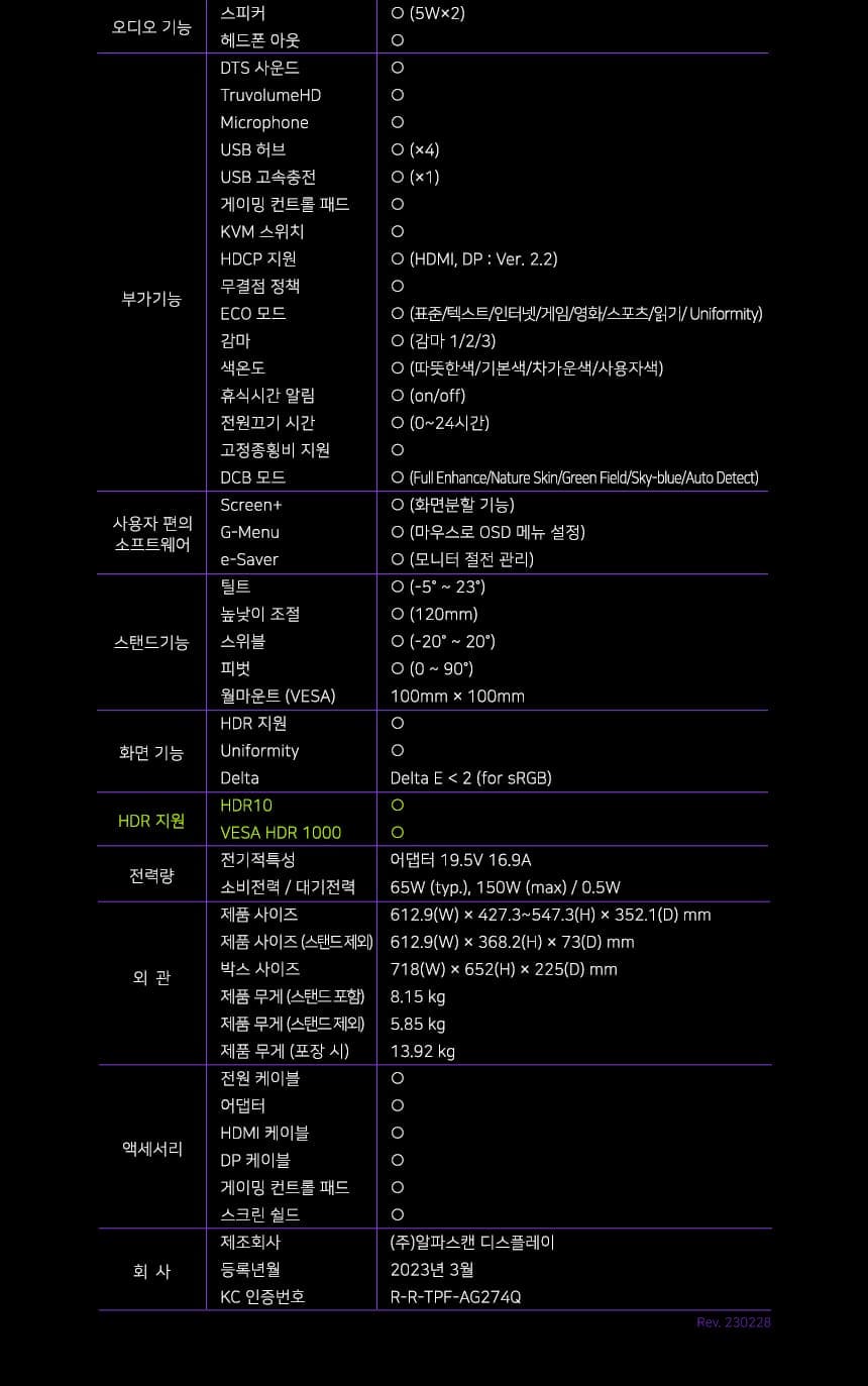 | 부가 기능 | HDCP 지원, KVM 스위치, LED 조명, SW 화면분할, USB-PD 지원, USB허브, 도킹스테이션, 무결점 정책, 스피커, 전용 키패드, 차광 후드, 헤드폰 아웃 |